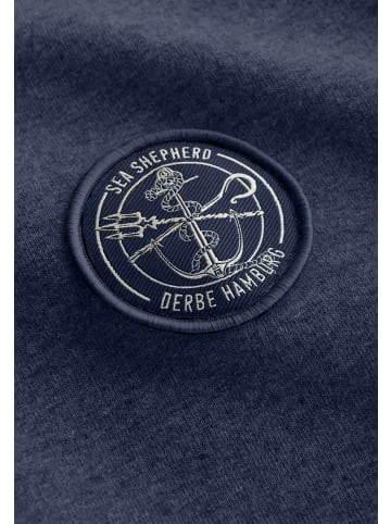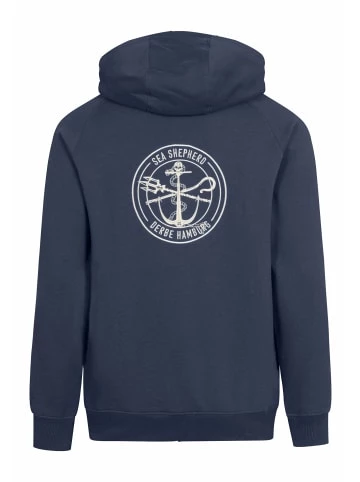 Herren Sweatjacke von derbe, die in Kooperation mit der Meerestierschutzorganisation SEA SHEPHERD konzipiert wurde. – Stickerei und Badge – Rib-Bündchen am Saum und Ärmelsaum – Fairtrade Cotton – Grüner Knopf – Global Organic Textile Standard (GOTS organic in conversion), Lizenznummer: CU1010966